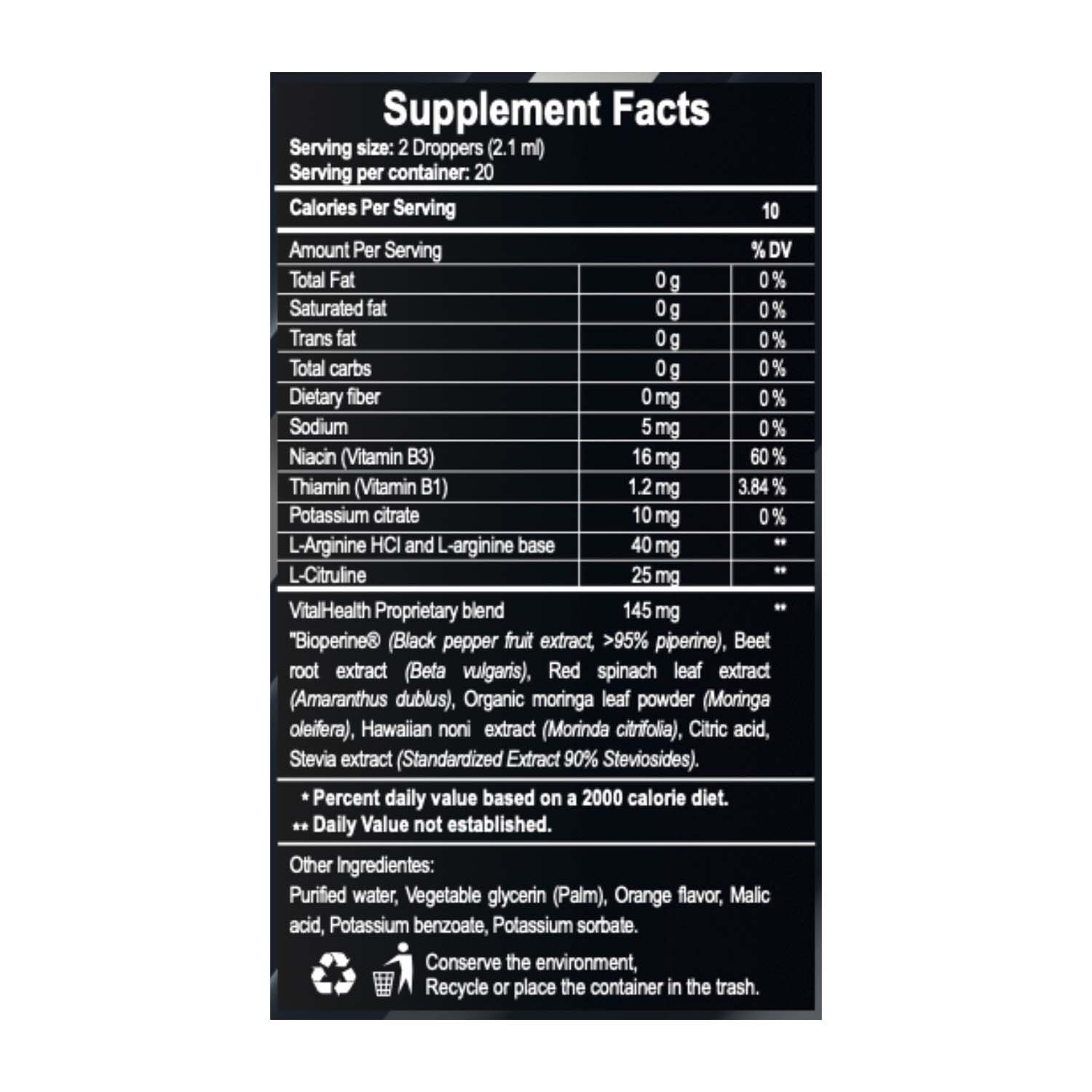 Agua, L-Arginina, L-Citrulina, Sabor natural de Naranja, Glicerina, Niacinamida (Vitamina B3), Potasio, Pimienta negra (Piper nigrum) con piperina al 95 %, Betabel (Beta vulgaris), Noni (Morinda citrifolia), Moringa (Moringa oleifera), Espinaca roja (Amaranthus spp.), Ácido cítrico, Sorbato de potasio, Benzoato de potasio, Sucralosa y Stevia como endulzante.